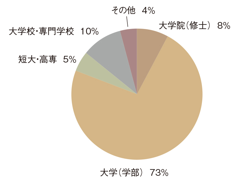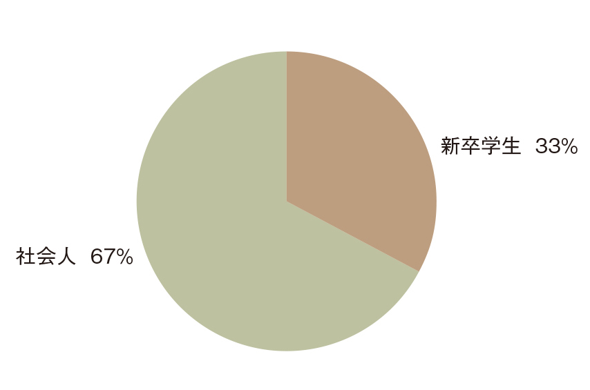約7割の方が社会人学生です。時間をやり繰りし、仕事と学業を両立させています。また、いったんキャリアをリセットした後、次のステップに備えるべく一定期間学業に専念されているケースも見られます。就業経験のない新卒学生の方にとっては、こうした方々との交流も、近未来の自分像やキャリアプランを描くうえでの貴重な経験となるでしょう。